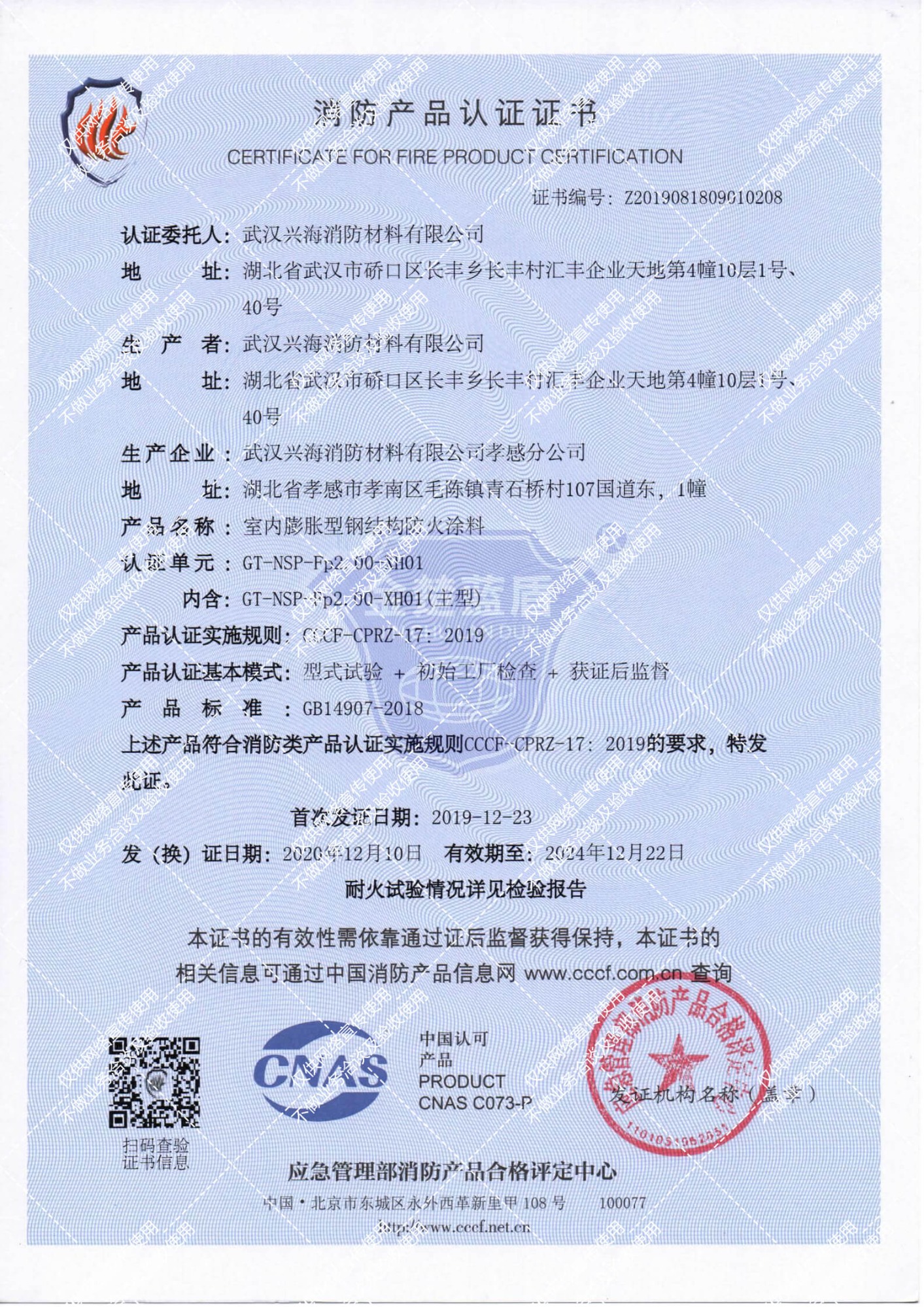 室內(nèi)非膨脹型2小時(shí)鋼結(jié)構(gòu)防火涂料消防產(chǎn)品認(rèn)證證書(shū)
