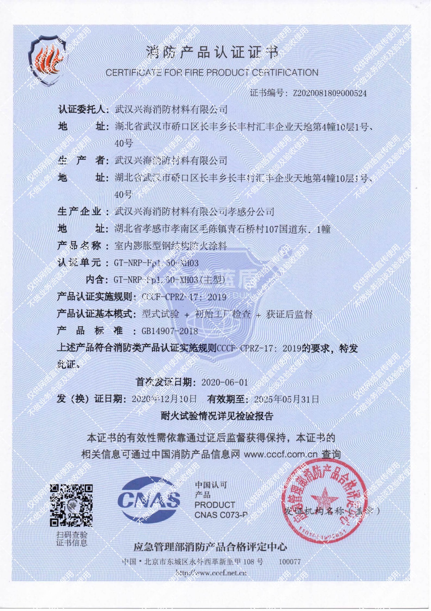 室內(nèi)膨脹型(油性)1.5小時(shí)鋼結(jié)構(gòu)防火涂料消防產(chǎn)品認(rèn)證證書